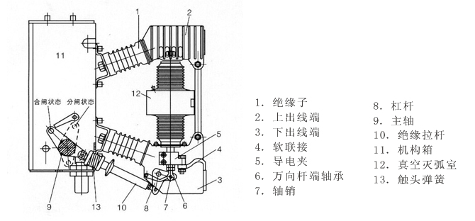 進(jìn)口滅弧室的觸頭開(kāi)距西門(mén)子公司為8±1mm(31.5kA、40Ka);美國西屋公司為8 mm(31.5kA);8±1mm(40kA)。·總體結構圖(真空斷路器3AF型(ZN12-12系列))